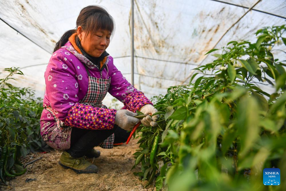 A villager picks peppers at a greenhouse base for vegetable plantation in Jinggang Town of Wangcheng District, Changsha, central China's Hunan Province, Dec. 21, 2023.?(Xinhua/Chen Zeguo)