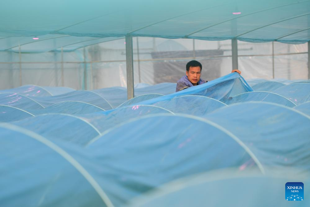 A villager checks the operation of supplement lights and the applying of agricultural greenhouse films at a greenhouse base for vegetable plantation in Jinggang Town of Wangcheng District, Changsha, central China's Hunan Province, Dec. 21, 2023.?(Xinhua/Chen Zeguo)