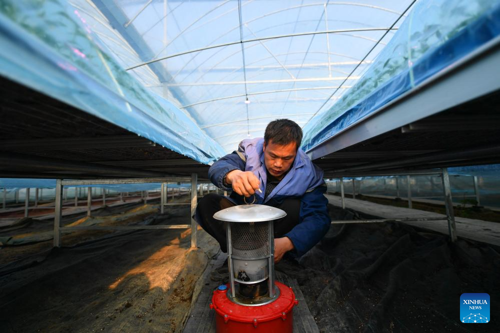 A villager checks the operation of a heating stove at a greenhouse base for vegetable plantation in Jinggang Town of Wangcheng District, Changsha, central China's Hunan Province, Dec. 21, 2023. (Xinhua/Chen Zeguo)