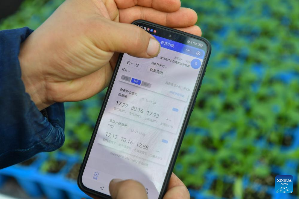 A villager checks the temperature and moisture inside a greenhouse via a mobile phone application at a greenhouse base for vegetable plantation in Jinggang Town of Wangcheng District, Changsha, central China's Hunan Province, Dec. 21, 2023.?(Xinhua/Chen Zeguo)