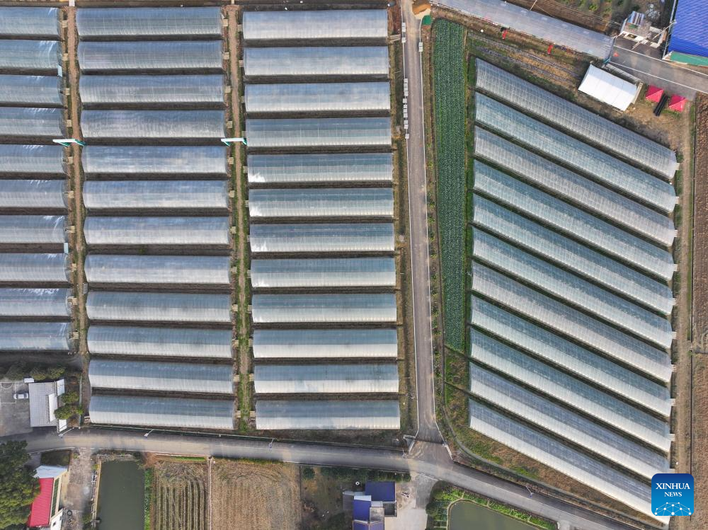 This aerial photo taken on Dec. 21, 2023 shows a greenhouse base for vegetable plantation in Jinggang Town of Wangcheng District, Changsha, central China's Hunan Province.?(Xinhua/Chen Zeguo)