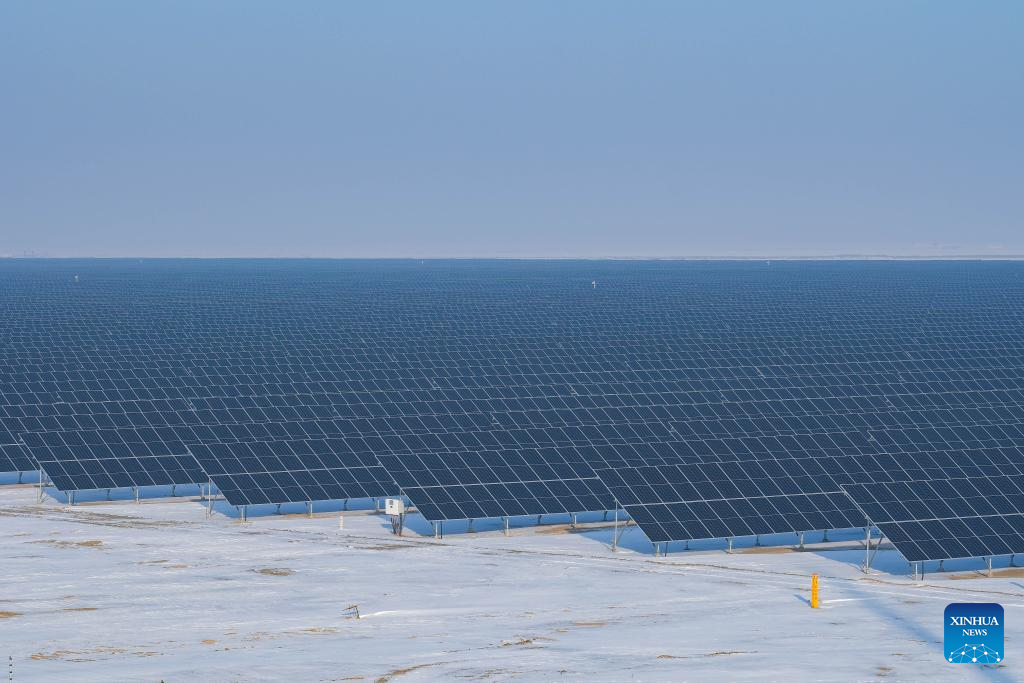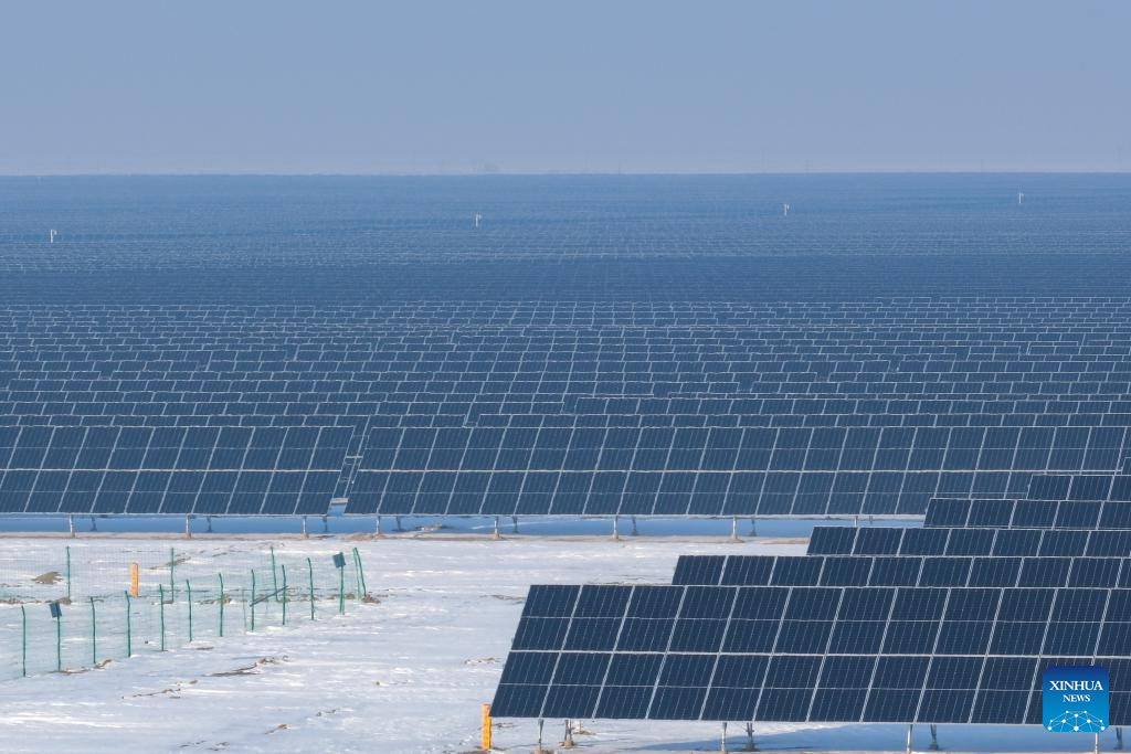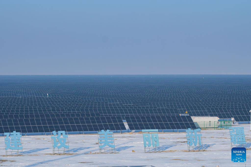 This photo taken on Dec. 20, 2023 shows a photovoltaic power project in Kazak Autonomous County of Mori, Changji Hui Autonomous Prefecture, northwest China's Xinjiang Uygur Autonomous Region. With abundant solar and wind energy, Kazak Autonomous County of Mori has sped up the development of clean energy, attracting many new energy enterprises here. (Xinhua/Zhang Cheng)