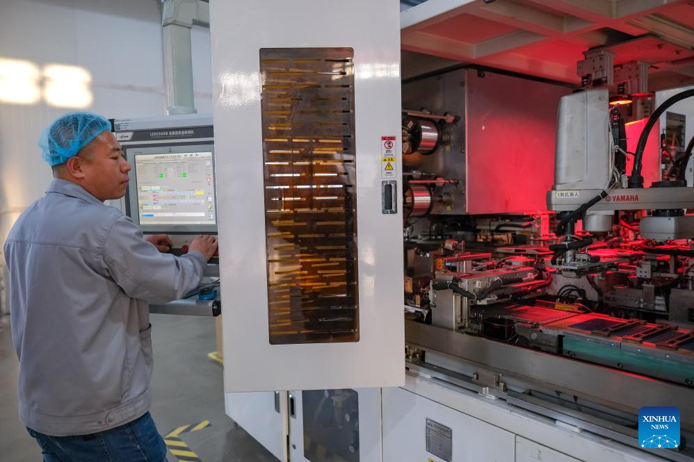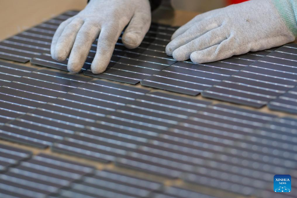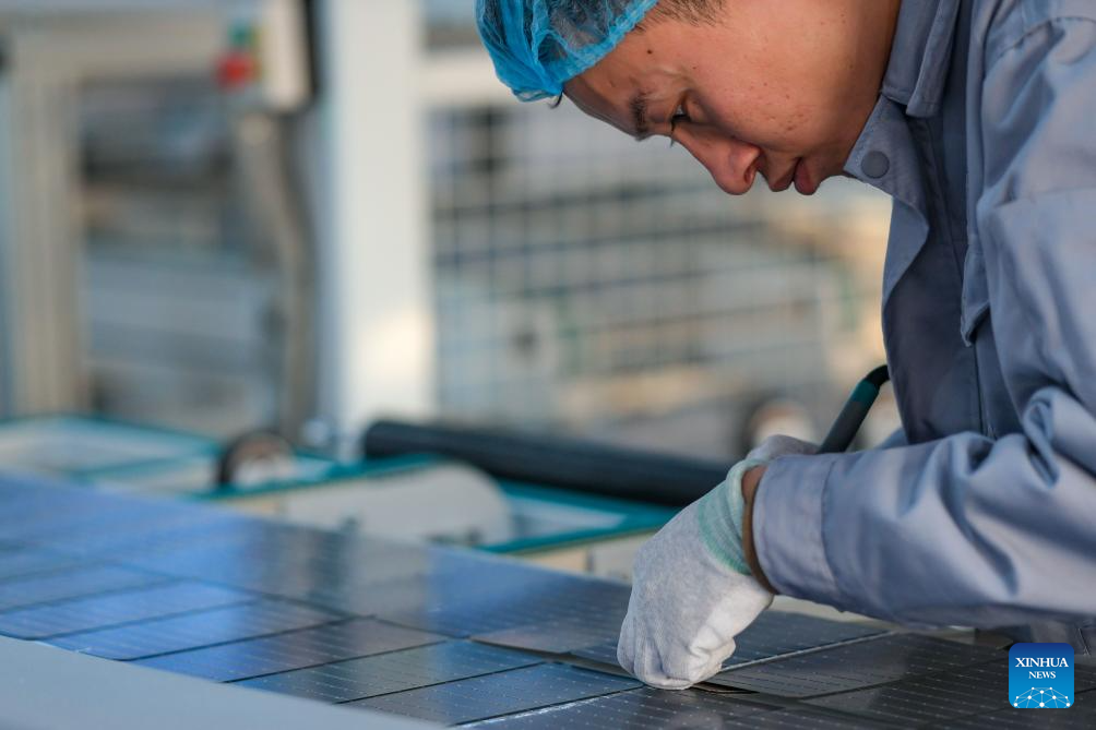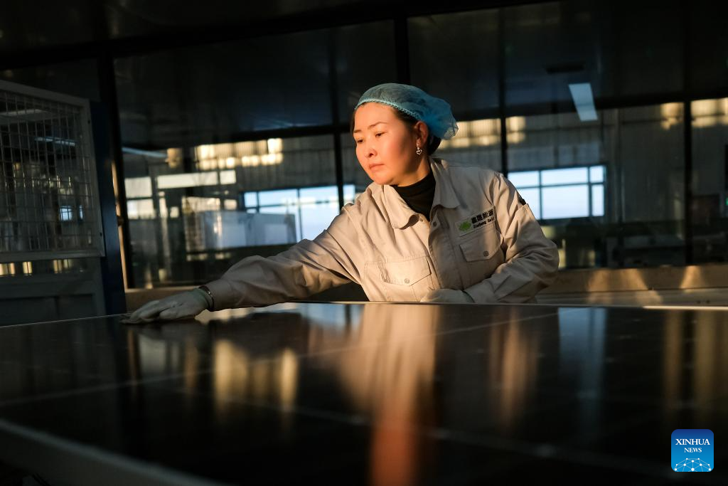 A staff member works at a photovoltaic component workshop in Kazak Autonomous County of Mori, Changji Hui Autonomous Prefecture, northwest China's Xinjiang Uygur Autonomous Region, Dec. 21, 2023. With abundant solar and wind energy, Kazak Autonomous County of Mori has sped up the development of clean energy, attracting many new energy enterprises here. (Xinhua/Zhang Cheng)