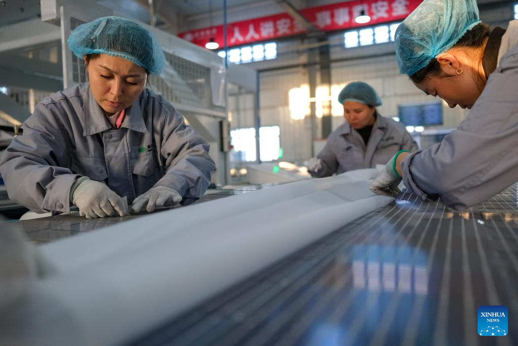 Staff members work at a photovoltaic component workshop in Kazak Autonomous County of Mori, Changji Hui Autonomous Prefecture, northwest China's Xinjiang Uygur Autonomous Region, Dec. 21, 2023. With abundant solar and wind energy, Kazak Autonomous County of Mori has sped up the development of clean energy, attracting many new energy enterprises here. (Xinhua/Zhang Cheng)