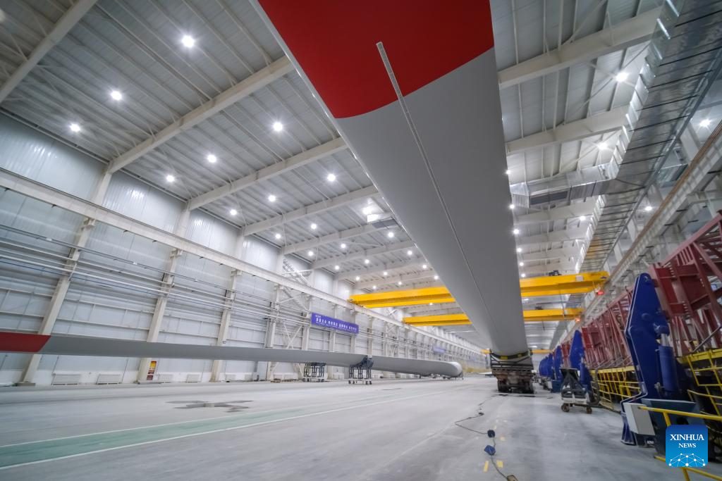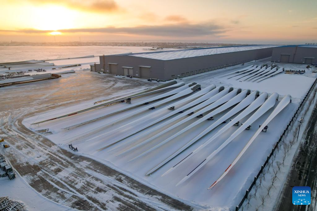 This photo taken on Dec. 21, 2023 shows a wind turbine blade workshop in Kazak Autonomous County of Mori, Changji Hui Autonomous Prefecture, northwest China's Xinjiang Uygur Autonomous Region. With abundant solar and wind energy, Kazak Autonomous County of Mori has sped up the development of clean energy, attracting many new energy enterprises here. (Xinhua/Zhang Cheng)