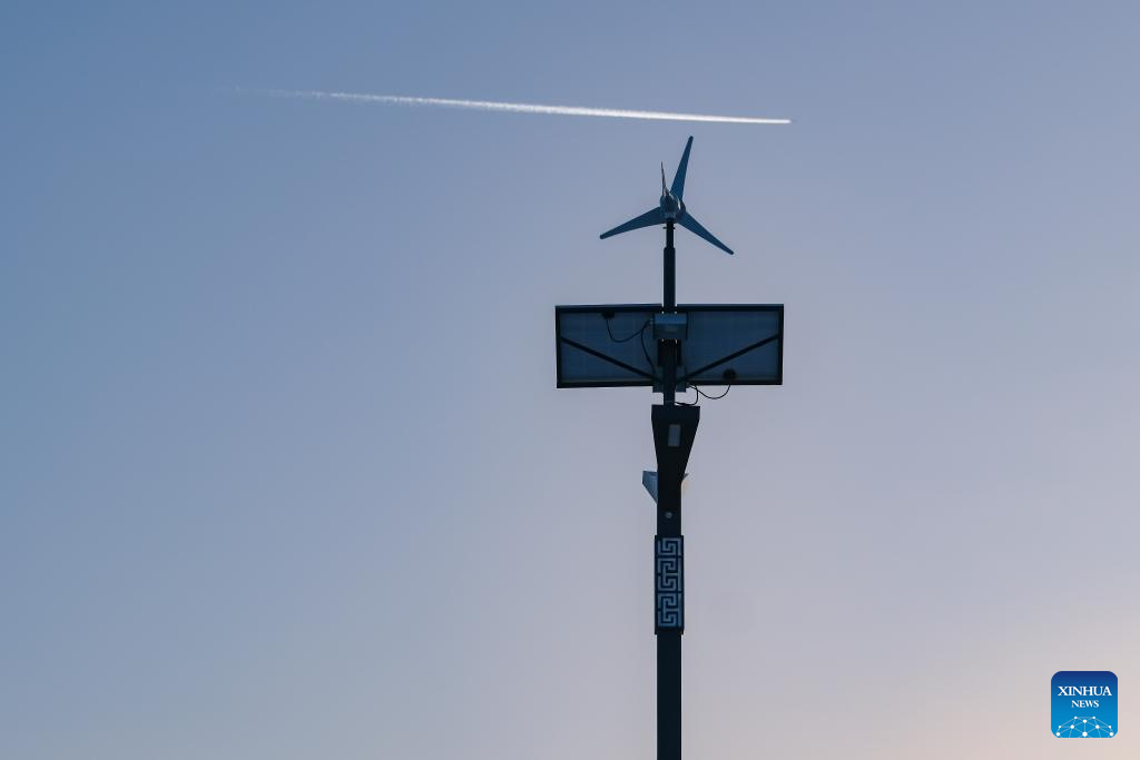 This photo taken on Dec. 21, 2023 shows a new energy lamp in Kazak Autonomous County of Mori, Changji Hui Autonomous Prefecture, northwest China's Xinjiang Uygur Autonomous Region. With abundant solar and wind energy, Kazak Autonomous County of Mori has sped up the development of clean energy, attracting many new energy enterprises here. (Xinhua/Zhang Cheng)