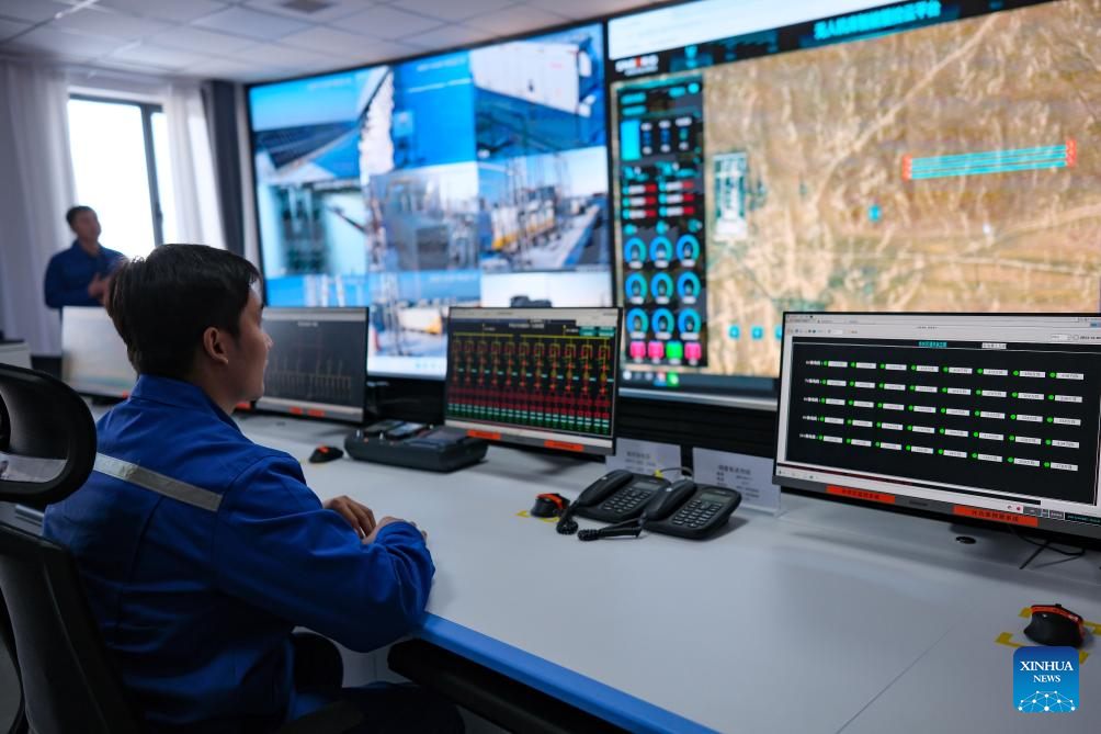 A staff member monitors the device at the central control room of a photovoltaic power project in Kazak Autonomous County of Mori, Changji Hui Autonomous Prefecture, northwest China's Xinjiang Uygur Autonomous Region, Dec. 20, 2023. With abundant solar and wind energy, Kazak Autonomous County of Mori has sped up the development of clean energy, attracting many new energy enterprises here. (Xinhua/Zhang Cheng)