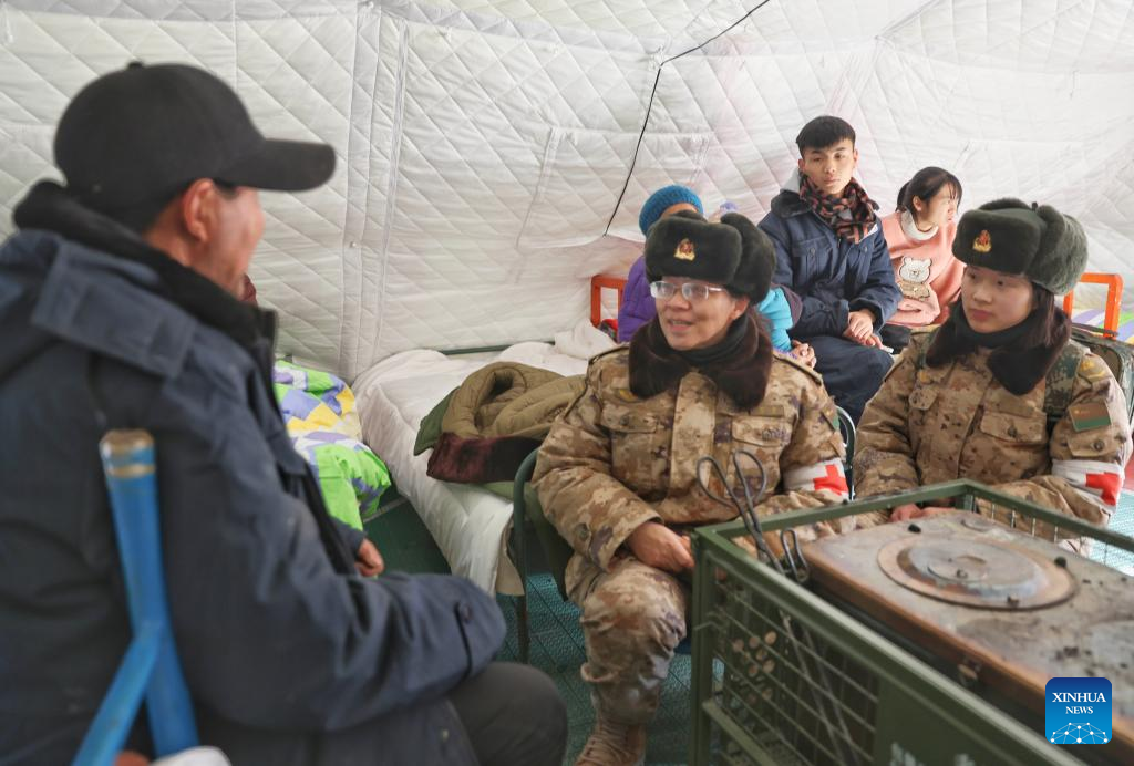 A military medic treats a patient in Xiaojia Village of Jishishan County, northwest China's Gansu Province, Dec. 22, 2023. The Chinese People's Liberation Army (PLA) and the People's Armed Police Force (PAPF) have deployed multiple rescue forces to quake-hit areas in response to a 6.2-magnitude earthquake that jolted northwest China's Gansu Province late Monday. (Photo by Hou Chonghui/Xinhua)