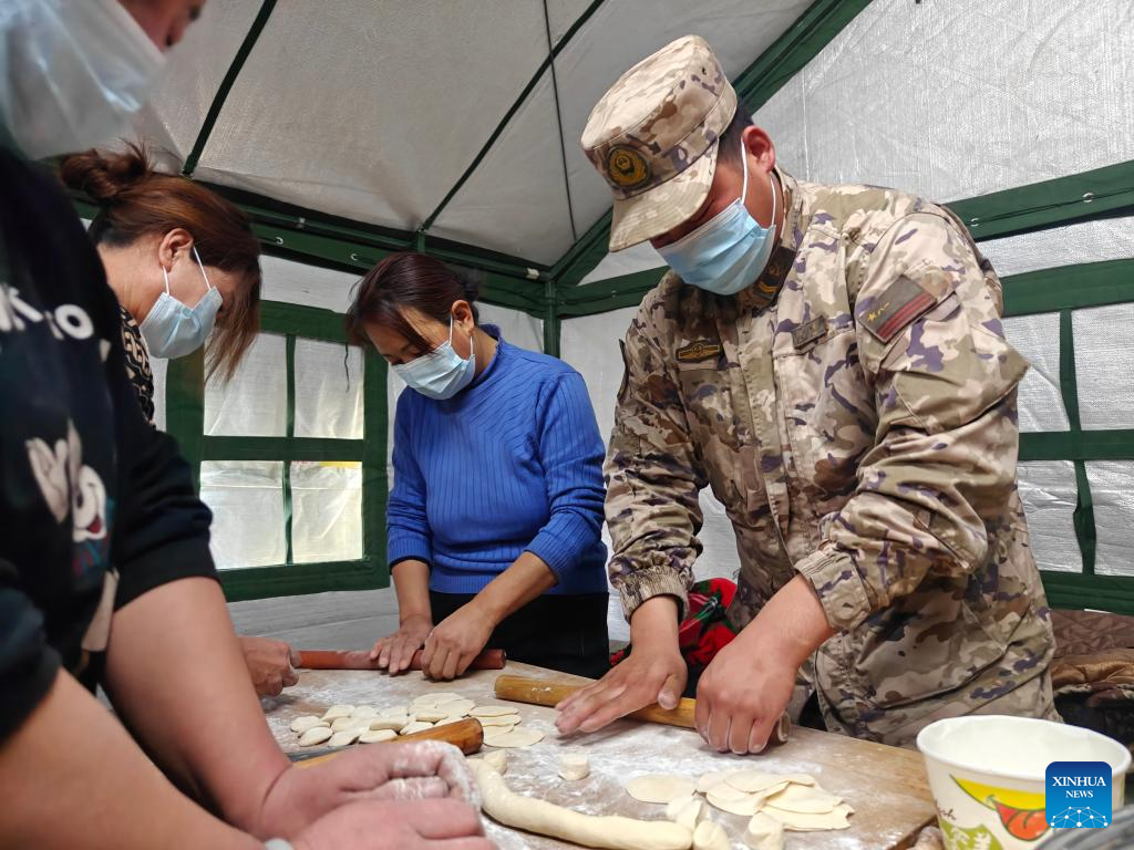 A soldier makes dumplings with quake-affected residents at a temporary relocation site in Zhongchuan Township of Minhe County in northwest China's Qinghai Province, Dec. 22, 2023. The Chinese People's Liberation Army (PLA) and the People's Armed Police Force (PAPF) have deployed multiple rescue forces to quake-hit areas in response to a 6.2-magnitude earthquake that jolted northwest China's Gansu Province late Monday. In Qinghai Province, the earthquake had killed 31 people as of Thursday. (Photo by Han Zhen/Xinhua)