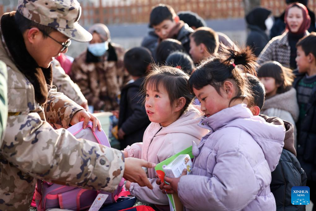 A soldier distributes school supplies to students at a temporary "tent school" in Gaoli Village of Jishishan County, northwest China's Gansu Province, Dec. 22, 2023. The Chinese People's Liberation Army (PLA) and the People's Armed Police Force (PAPF) have deployed multiple rescue forces to quake-hit areas in response to a 6.2-magnitude earthquake that jolted northwest China's Gansu Province late Monday. (Photo by Hou Chonghui/Xinhua)