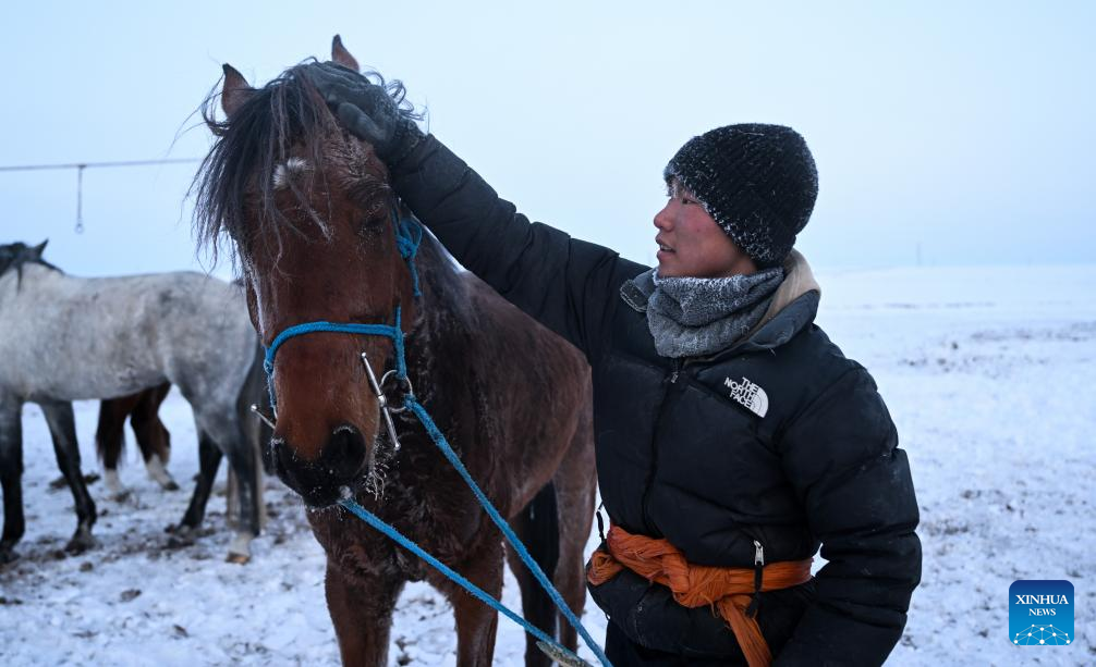 Erdendalai pats a horse on the pasture in Hulun Buir, north China's Inner Mongolia Autonomous Region, Dec. 15, 2023. (Xinhua/Wang Kaiyan)