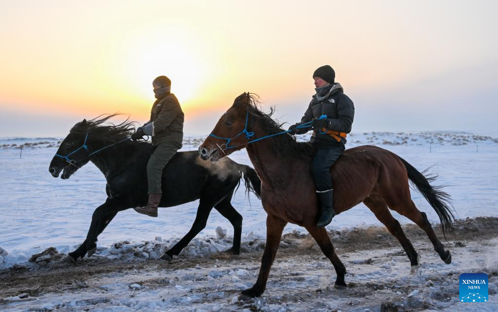 Ijil (L) takes part in a horse racing competition of the Nadam fair in Hulun Buir, north China's Inner Mongolia Autonomous Region, Dec. 17, 2023. (Xinhua/Bei He)