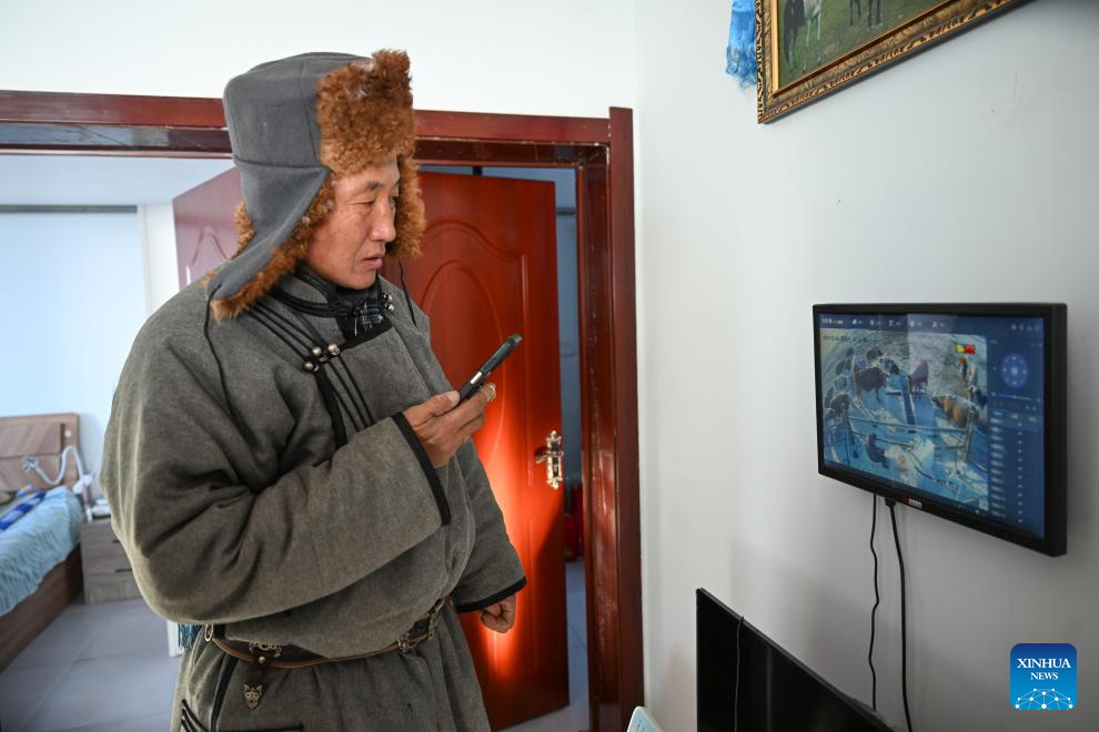 Erdendalai checks the cattle and sheep in the pen at home through surveillance camera in Hulun Buir, north China's Inner Mongolia Autonomous Region, Dec. 16, 2023. (Xinhua/Bei He)
