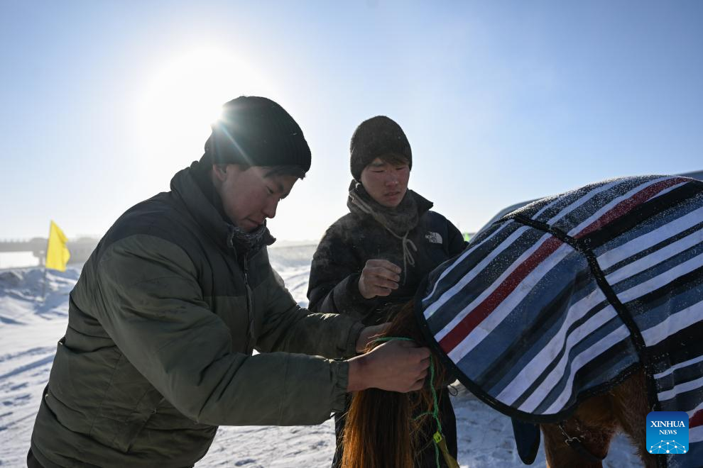 Ijil (L) ties the horse tail before attending a horse race of the Nadam fair in Hulun Buir, north China's Inner Mongolia Autonomous Region, Dec. 17, 2023. This is a local traditional custom, which is convenient for horses to race and also represents the expectation of good luck. (Xinhua/Bei He)