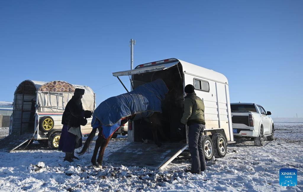 Erdendalai (L) and Ijil bring a horse to a horse trailer before heading for the horse racing venue of the Nadam fair in Hulun Buir, north China's Inner Mongolia Autonomous Region, Dec. 17, 2023. (Xinhua/Wang Kaiyan)