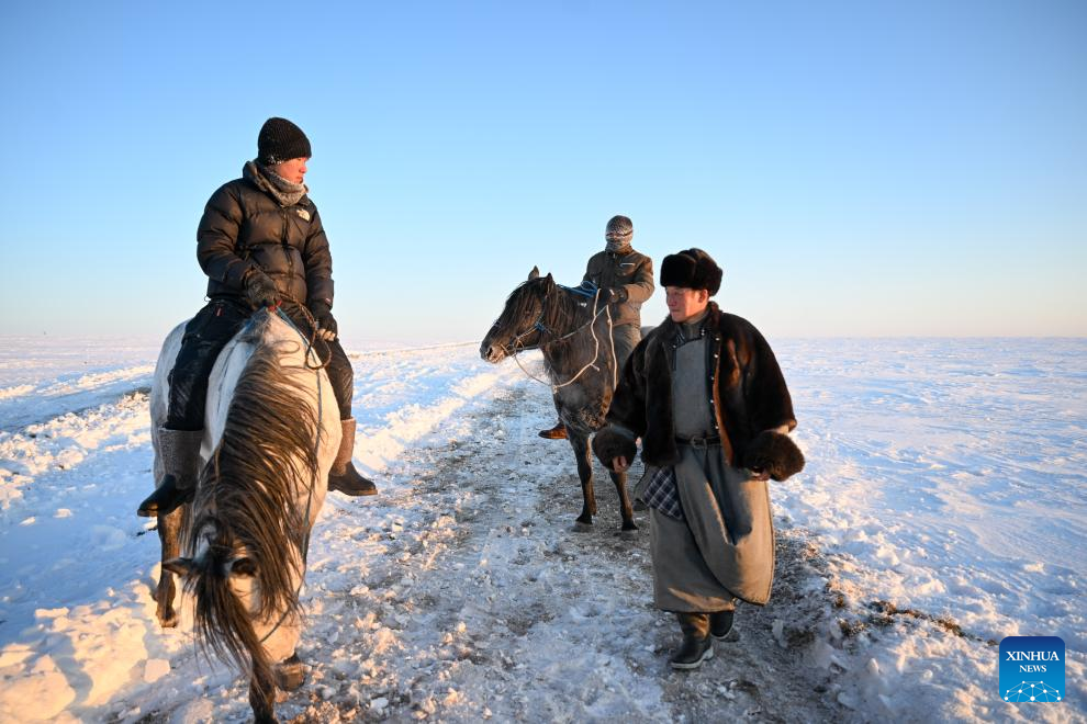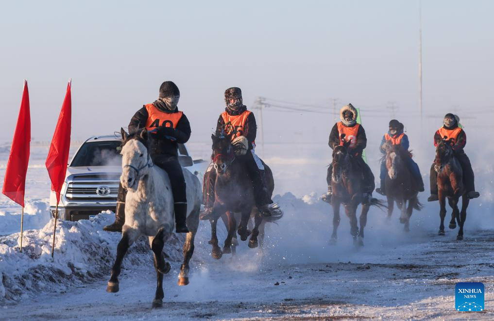 Nairag (1st L) takes part in a horse racing competition of the Nadam fair in Hulun Buir, north China's Inner Mongolia Autonomous Region, Dec. 17, 2023. (Xinhua/Wang Kaiyan)