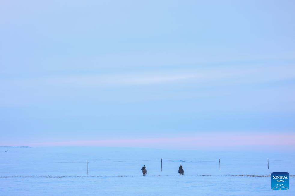 Nairag (C), Ijil (R) and Erdendalai train horses on the pasture in Hulun Buir, north China's Inner Mongolia Autonomous Region, Dec. 15, 2023. (Xinhua/Wang Kaiyan)