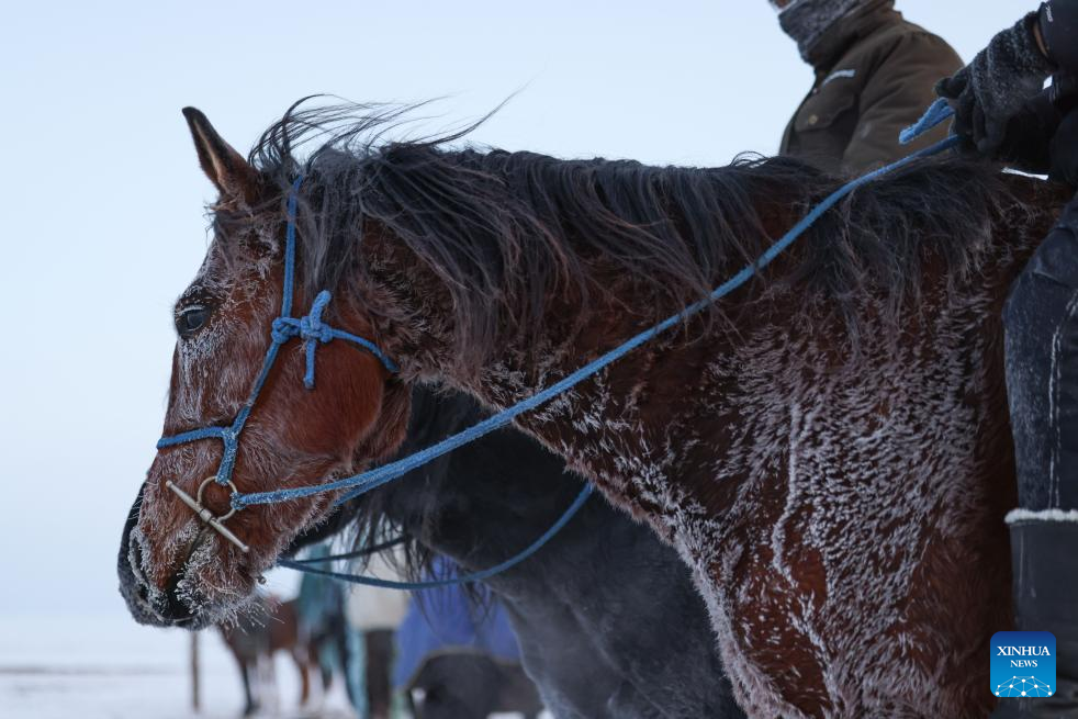 Erdendalai feeds a horse after a race in Hulun Buir, north China's Inner Mongolia Autonomous Region, Dec. 17, 2023. (Xinhua/Bei He)