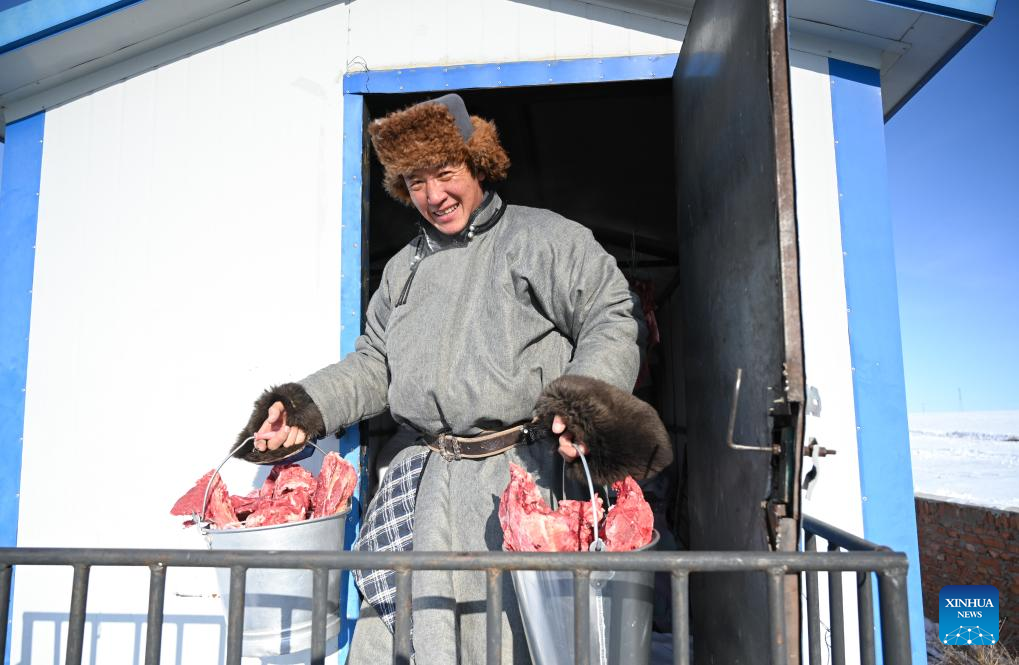 Erdendalai takes out the beef for lunch in Hulun Buir, north China's Inner Mongolia Autonomous Region, Dec. 16, 2023. (Xinhua/Wang Kaiyan)