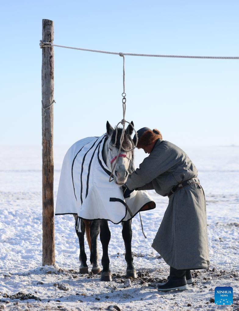 Erdendalai puts on a jacket for a horse in Hulun Buir, north China's Inner Mongolia Autonomous Region, Dec. 16, 2023. (Xinhua/Wang Kaiyan)