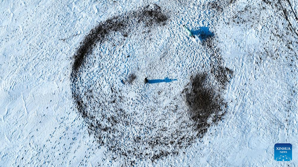 This aerial photo shows Erdendalai driving to follow Nairag and Ijil as they train horses in Hulun Buir, north China's Inner Mongolia Autonomous Region, Dec. 16, 2023. (Xinhua/Bei He)