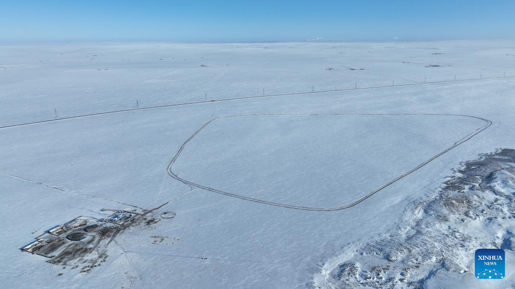 This aerial photo shows Erdendalai's home and a racecourse track he built in Hulun Buir, north China's Inner Mongolia Autonomous Region, Dec. 16, 2023. (Xinhua/Bei He)