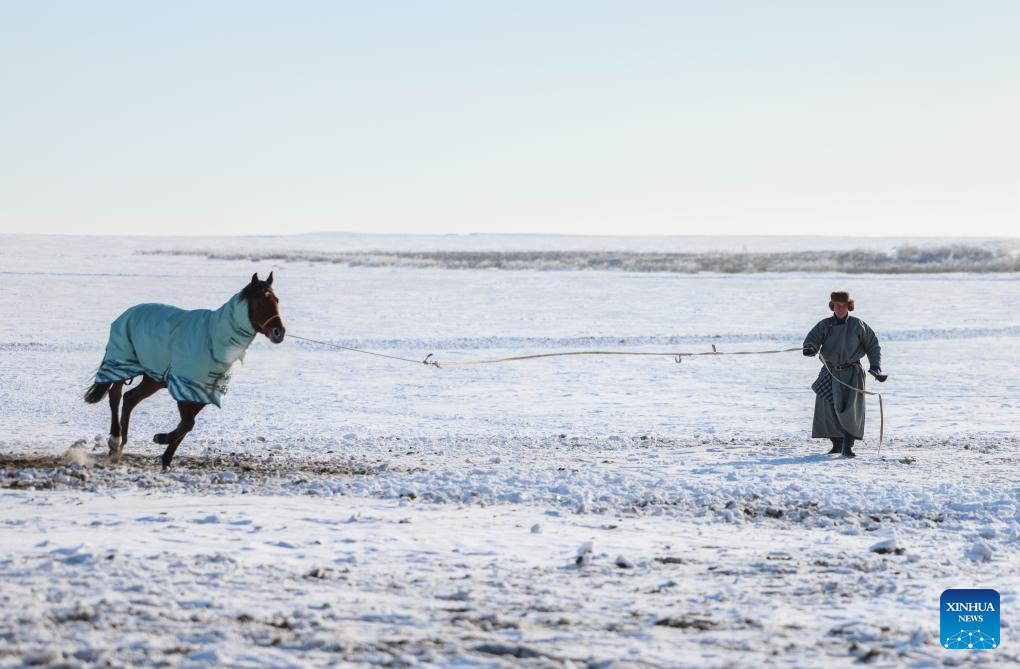 Nairag trains a horse on the pasture in Hulun Buir, north China's Inner Mongolia Autonomous Region, Dec. 15, 2023. (Xinhua/Bei He)