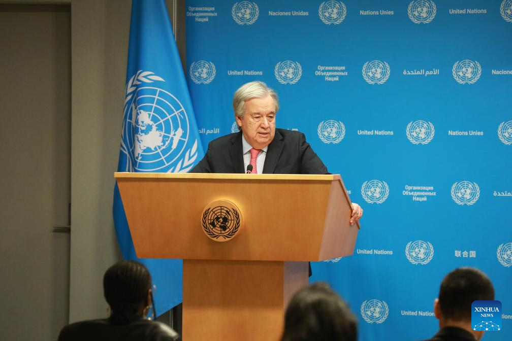 UN Secretary-General Antonio Guterres speaks to reporters at the UN headquarters in New York, on Dec. 22, 2023. Guterres said Friday that the Israeli offensive is creating massive obstacles to the distribution of humanitarian aid inside Gaza. (Xinhua/Xie E)