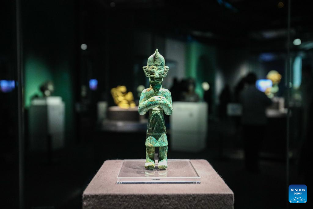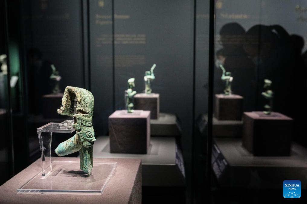 A bronze relic from China's Sanxingdui Ruins is displayed during an exhibition titled "Glory of Bronze Civilization" in the Museum of Shanghai University in Shanghai, east China, Dec. 22, 2023. The exhibition features sculptures by the French sculptor Auguste Rodin and bronze relics from China's Sanxingdui Ruins. (Xinhua/Xin Mengchen)