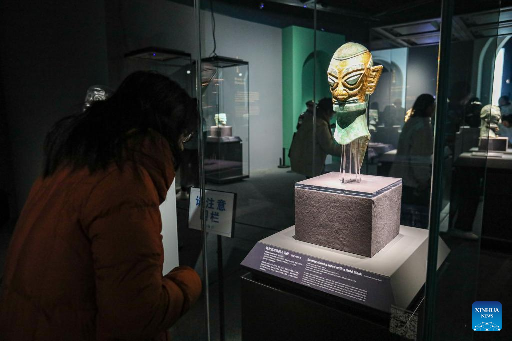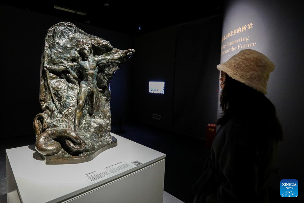 A visitor looks at a sculpture during an exhibition titled "Glory of Bronze Civilization" in the Museum of Shanghai University in Shanghai, east China, Dec. 22, 2023. The exhibition features sculptures by the French sculptor Auguste Rodin and bronze relics from China's Sanxingdui Ruins. (Xinhua/Xin Mengchen)