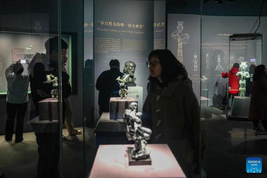 People visit an exhibition titled "Glory of Bronze Civilization" in the Museum of Shanghai University in Shanghai, east China, Dec. 22, 2023. The exhibition features sculptures by the French sculptor Auguste Rodin and bronze relics from China's Sanxingdui Ruins. (Xinhua/Xin Mengchen)