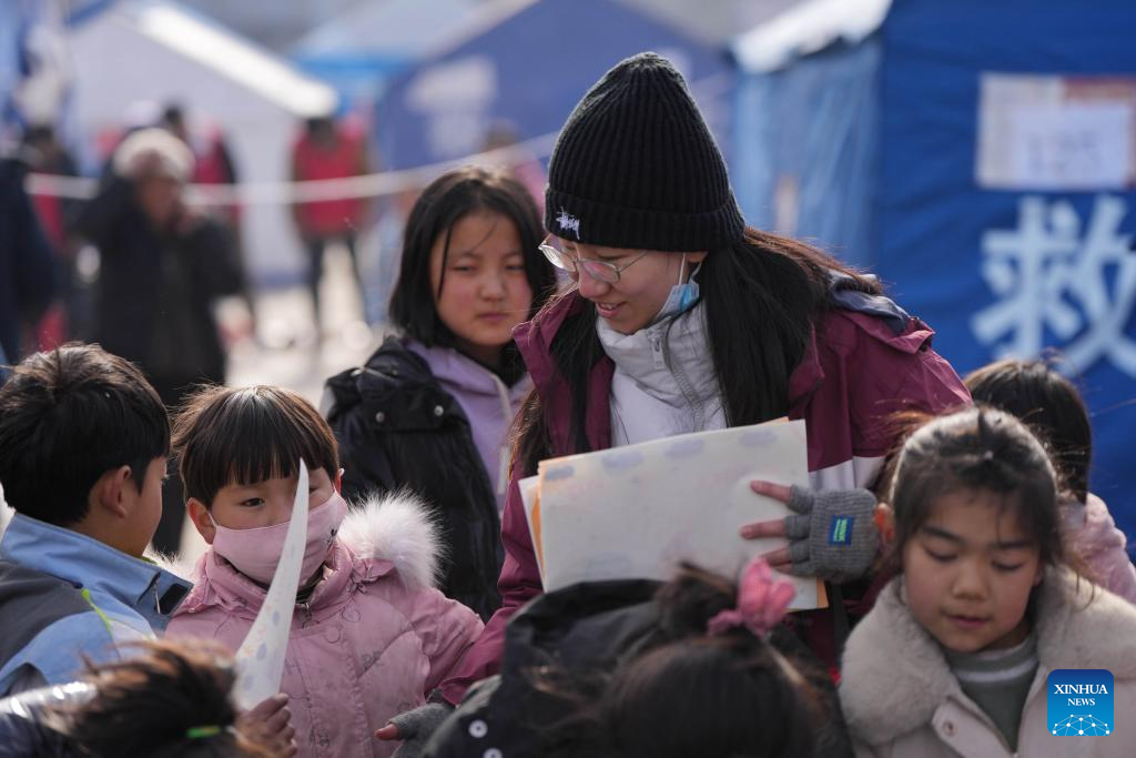 Psychotherapist Hu Jinya collects drawings of children at a temporary relocation site in Dahejia Township, Jishishan County, northwest China's Gansu Province, Dec. 22, 2023. After a 6.2-magnitude earthquake hit Gansu Province late Monday, volunteers and psychotherapists started to provide quake-affected children at the temporary relocation site with voluntary classes, including activities such as drawing, games, tutoring, etc. (Xinhua/Chen Bin)