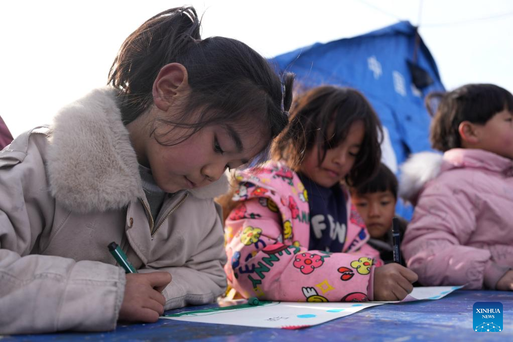 Children works on their drawings at a temporary relocation site in Dahejia Township, Jishishan County, northwest China's Gansu Province, Dec. 22, 2023. After a 6.2-magnitude earthquake hit Gansu Province late Monday, volunteers and psychotherapists started to provide quake-affected children at the temporary relocation site with voluntary classes, including activities such as drawing, games, tutoring, etc. (Xinhua/Chen Bin)