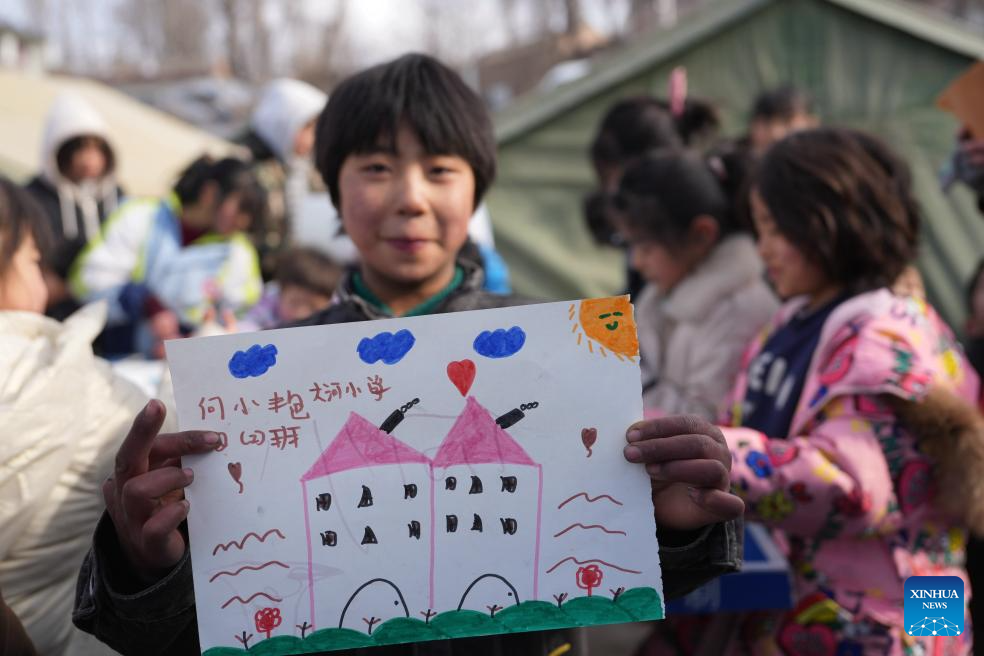A child shows her drawing at a temporary relocation site in Dahejia Township, Jishishan County, northwest China's Gansu Province, Dec. 22, 2023. After a 6.2-magnitude earthquake hit Gansu Province late Monday, volunteers and psychotherapists started to provide quake-affected children at the temporary relocation site with voluntary classes, including activities such as drawing, games, tutoring, etc. (Xinhua/Chen Bin)