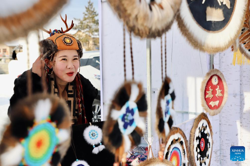 A visitor selects cultural and creative products in Beiji Village of Mohe, northeast China's Heilongjiang Province, Dec. 22, 2023. Known as China's "North Pole," Mohe has developed a variety of winter tourism programs in recent years, attracting tourists to experience an "extremely cold journey." (Xinhua/Xu Kaixin)