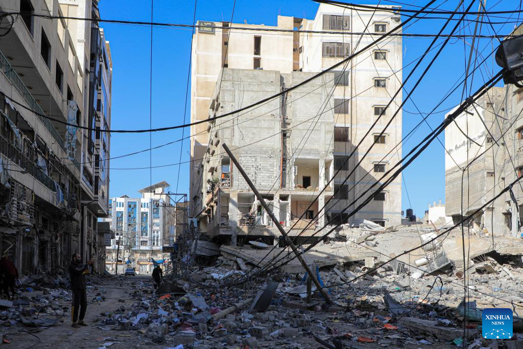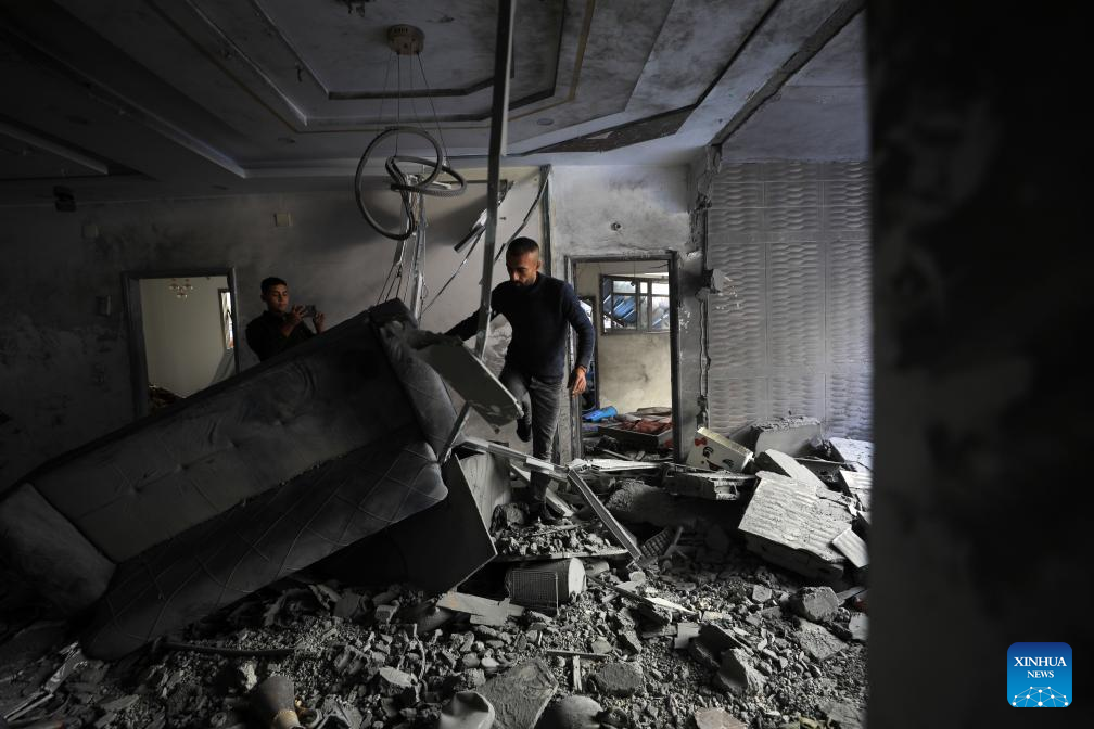 People inspect the damage after an Israeli strike in the southern Gaza Strip city of Khan Younis, on Dec. 24, 2023. At least 166 Palestinians were killed and 384 others were wounded during the past 24 hours by the ongoing Israeli attacks on the Gaza Strip, said the Gaza-based Health Ministry on Sunday. (Photo by Rizek Abdeljawad/Xinhua)