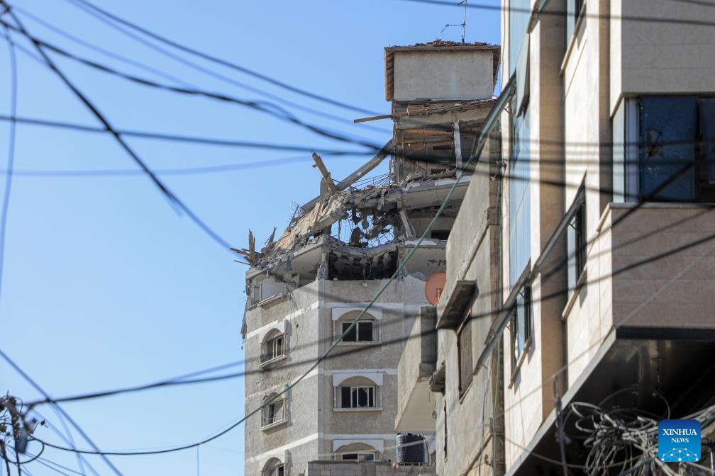 This photo taken on Dec. 24, 2023 shows a damaged building after an Israeli strike in the southern Gaza Strip city of Khan Younis. At least 166 Palestinians were killed and 384 others were wounded during the past 24 hours by the ongoing Israeli attacks on the Gaza Strip, said the Gaza-based Health Ministry on Sunday. (Photo by Rizek Abdeljawad/Xinhua)