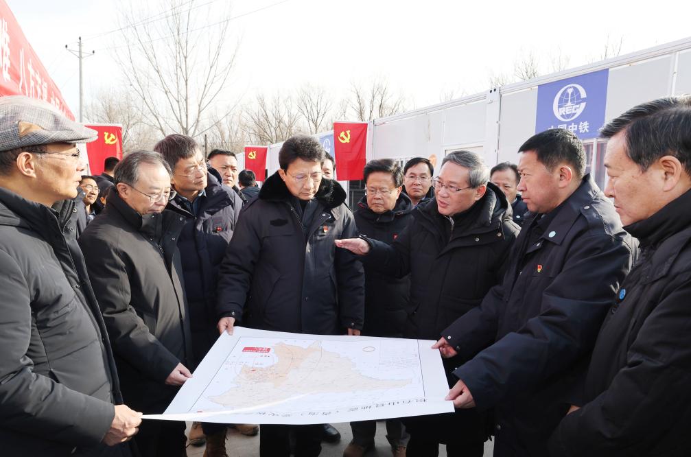 Chinese premier Li Qiang, also a member of the Standing Committee of the Political Bureau of the Communist Party of China Central Committee, learns about the work related to resettlement, relief supplies and the construction of temporary dwellings as he visits earthquake-hit Meiyi Village in Zhongchuan Township, Minhe County, northwest China's Qinghai Province, Dec. 23, 2023. Li on Saturday visited several villages in Jishishan County, Gansu Province, and Minhe County in the neighboring Qinghai Province. A 6.2-magnitude earthquake struck the areas at 11:59 p.m. Monday. (Xinhua/Yao Dawei)