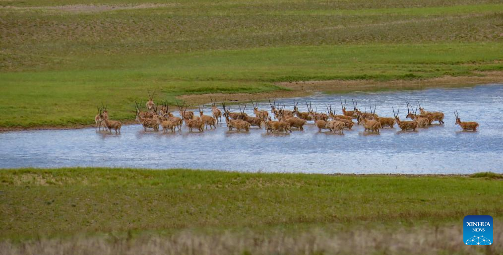 Tibetan antelopes are pictured by Kelsang Lhundrup as he patrols the Changtang National Nature Reserve in southwest China's Xizang Autonomous Region, Aug. 12, 2023. (Photo by Kelsang Lhundrup/Xinhua)