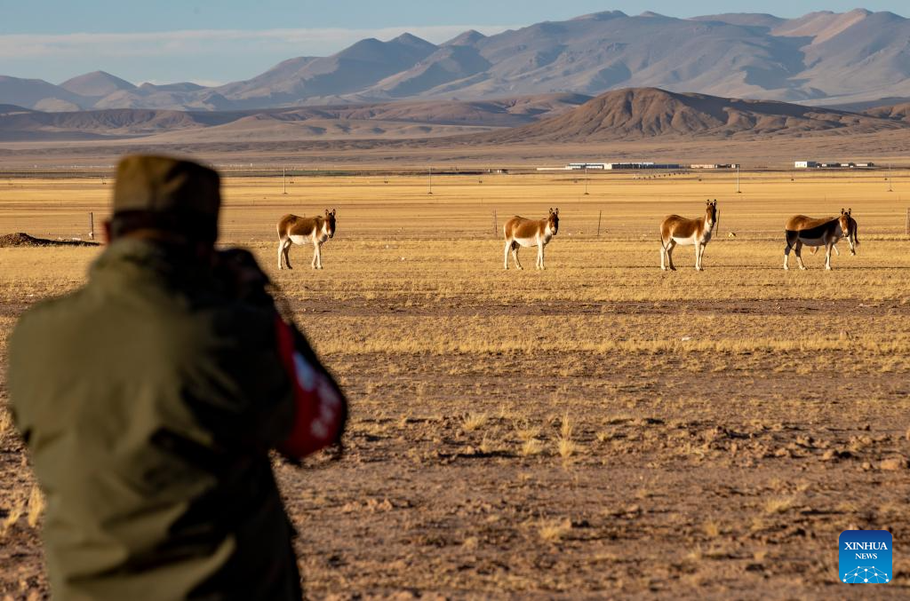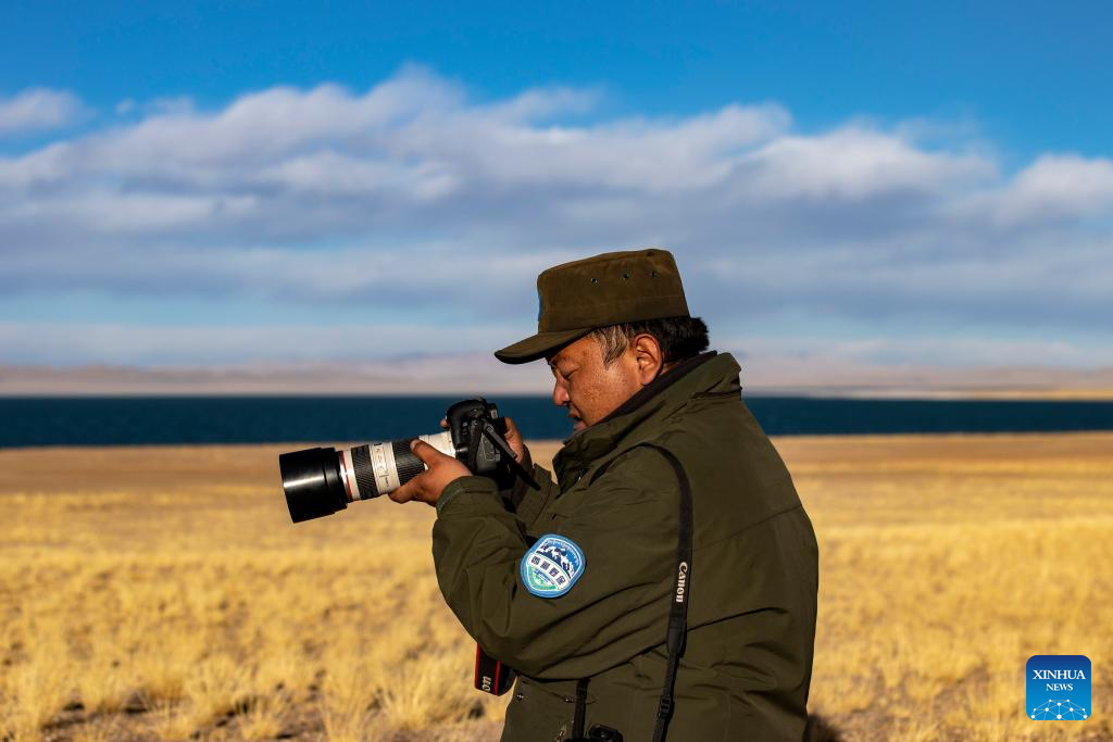 Kelsang Lhundrup takes photos of wild animals during his patrol at the Changtang National Nature Reserve in southwest China's Xizang Autonomous Region, Dec. 21, 2023. (Xinhua/Jiang Fan)