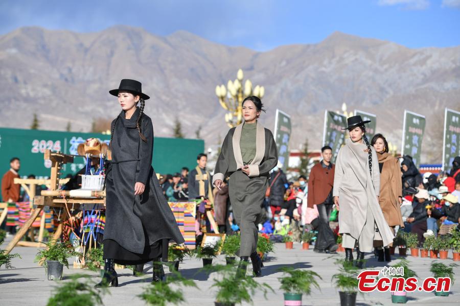 Models present traditional Tibetan costumes during the first Lhasa Fashion Week held at the Potala Palace square in Lhasa, southwest China's Xizang Autonomous Region, Dec. 24, 2023. Models presented 60 traditional Tibetan costumes in the fashion show. (Photo/China News Service)