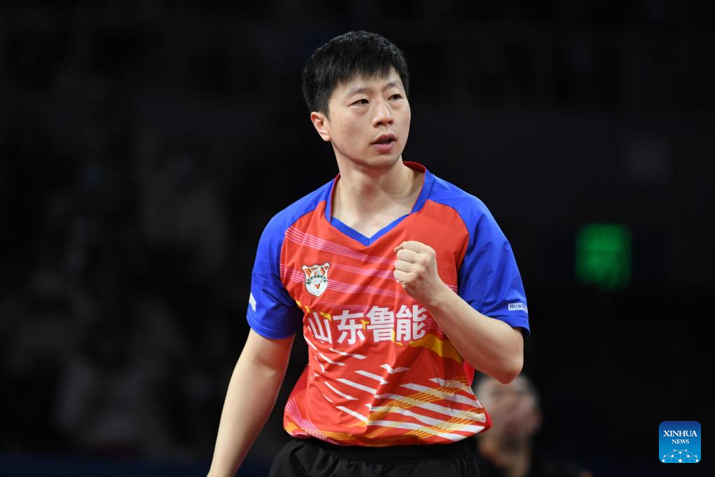 Ma Long of Shandong Luneng celebrates scoring while competing against Zhou Qihao of Shandong Weiqiao during the men's team final match between Shandong Luneng and Shandong Weiqiao at the 2023 Chinese Table Tennis Super League (CTTSL) in Shenzhen, south China's Guangdong Province, Dec. 24, 2023. (Xinhua/Liang Xu)