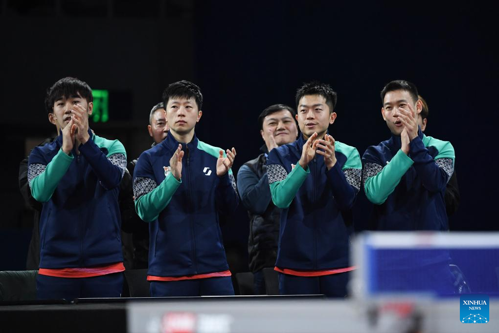 Ma Long (front 2nd L) of Shandong Luneng claps hands during the men's team final match between Shandong Luneng and Shandong Weiqiao at the 2023 Chinese Table Tennis Super League (CTTSL) in Shenzhen, south China's Guangdong Province, Dec. 24, 2023. (Xinhua/Liang Xu)