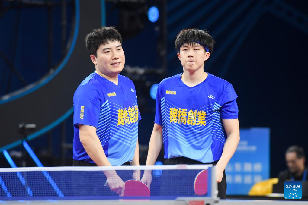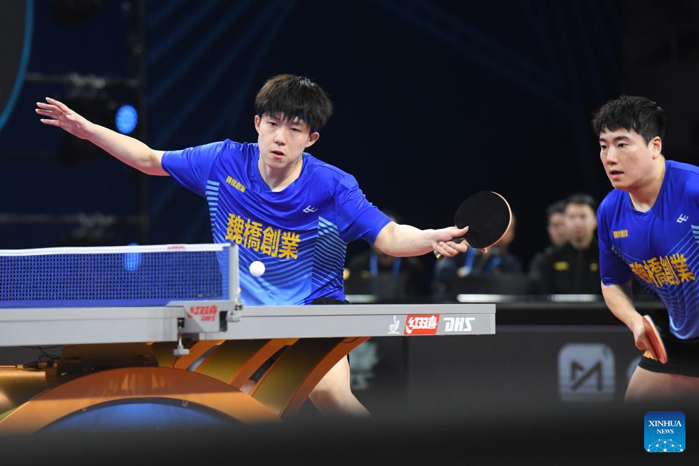 Wang Chuqin (L)/Liang Jingkun of Shandong Weiqiao compete against Yuan Licen/Xu Yingbin of Shandong Luneng during the men's team final match between Shandong Luneng and Shandong Weiqiao at the 2023 Chinese Table Tennis Super League (CTTSL) in Shenzhen, south China's Guangdong Province, Dec. 24, 2023. (Xinhua/Liang Xu)