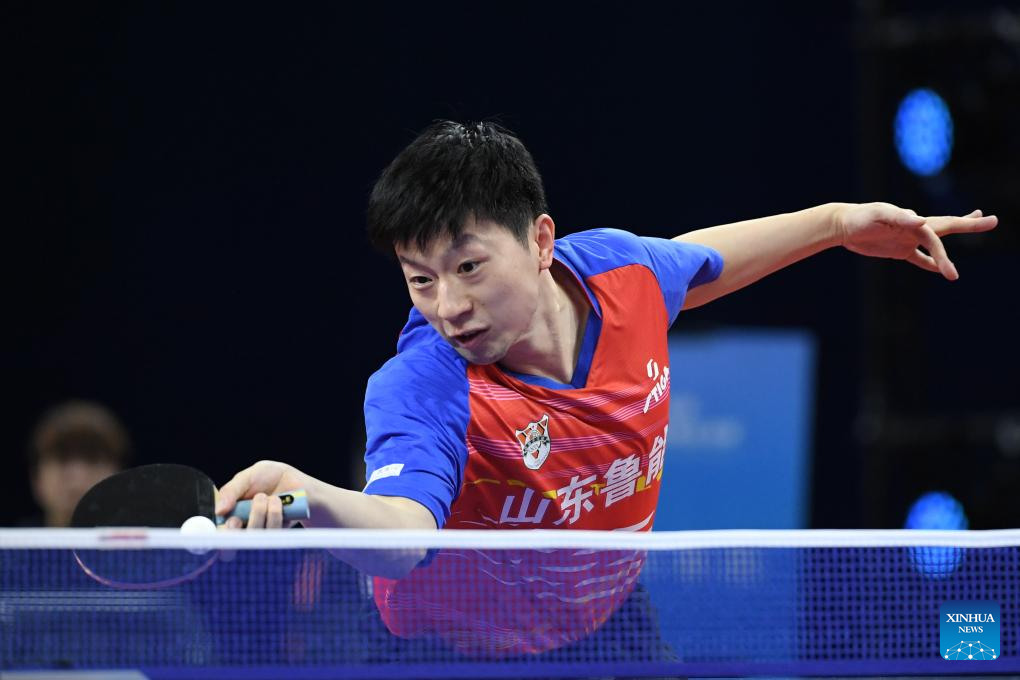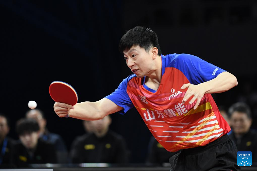 Ma Long of Shandong Luneng competes against Zhou Qihao of Shandong Weiqiao during the men's team final match between Shandong Luneng and Shandong Weiqiao at the 2023 Chinese Table Tennis Super League (CTTSL) in Shenzhen, south China's Guangdong Province, Dec. 24, 2023. (Xinhua/Liang Xu)