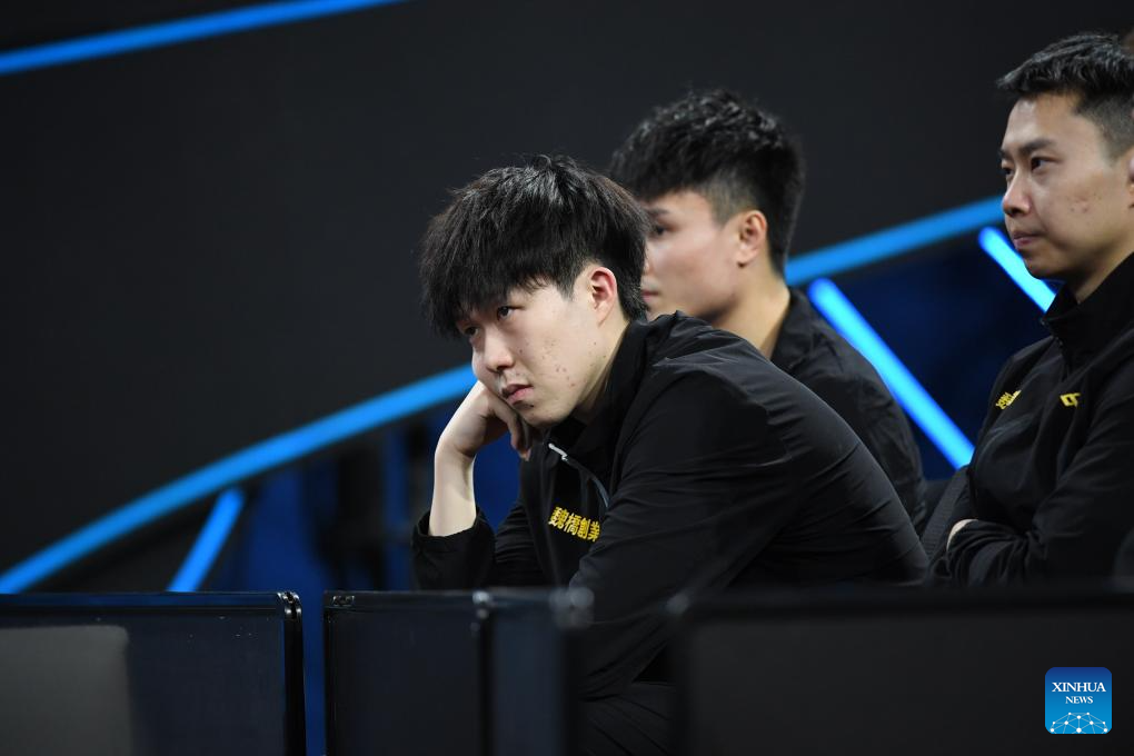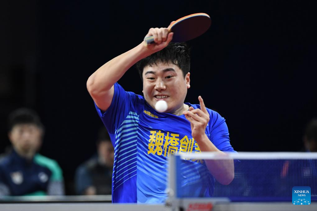 Liang Jingkun of Shandong Weiqiao competes against Xu Yingbin of Shandong Luneng during the men's team final match between Shandong Luneng and Shandong Weiqiao at the 2023 Chinese Table Tennis Super League (CTTSL) in Shenzhen, south China's Guangdong Province, Dec. 24, 2023. (Xinhua/Liang Xu)