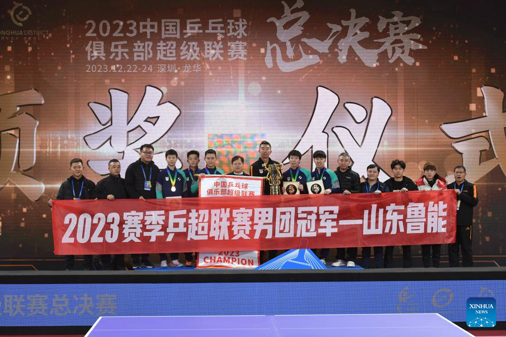 Champion team Shandong Luneng pose for photograph during the awarding ceremony after the men's team final match between Shandong Luneng and Shandong Weiqiao at the 2023 Chinese Table Tennis Super League (CTTSL) in Shenzhen, south China's Guangdong Province, Dec. 24, 2023. (Xinhua/Liang Xu)