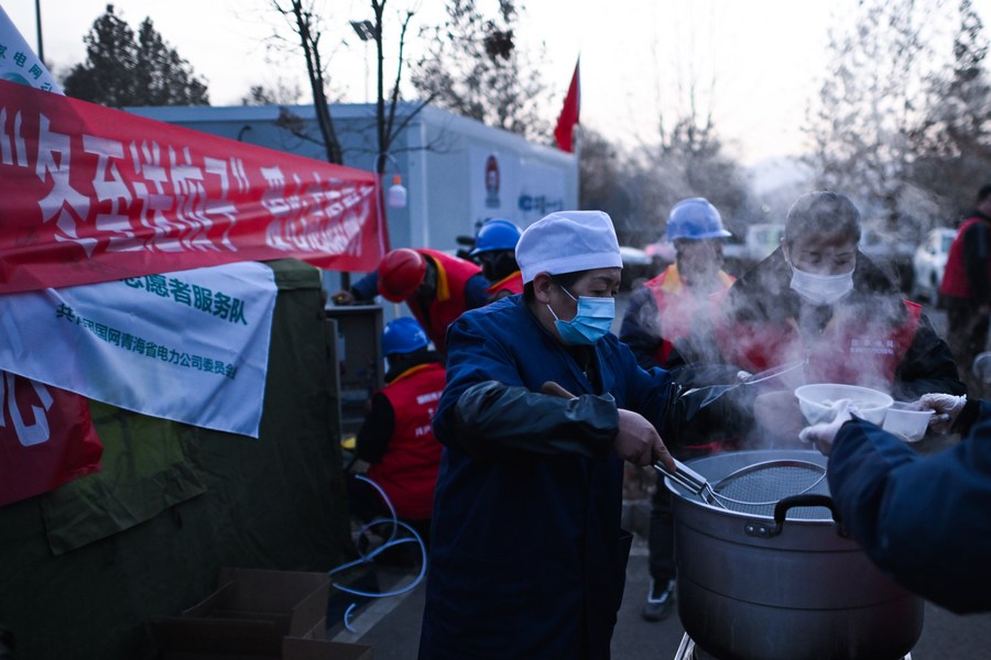 A staff member offers quake-affected people dumplings at a temporary relocation site in Lajia Village, Guanting Township, Minhe County in Haidong City, northwest China's Qinghai Province, Dec. 22, 2023. (Xinhua/Zhang Long)