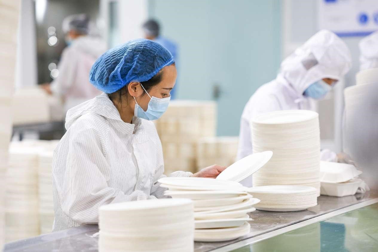 Degradable tableware is manufactured with bamboo pulp and sugarcane pulp in a workshop of an environmental protection tech firm in Yibin, southwest China's Sichuan province. (People's Daily Online/Wang Yu)