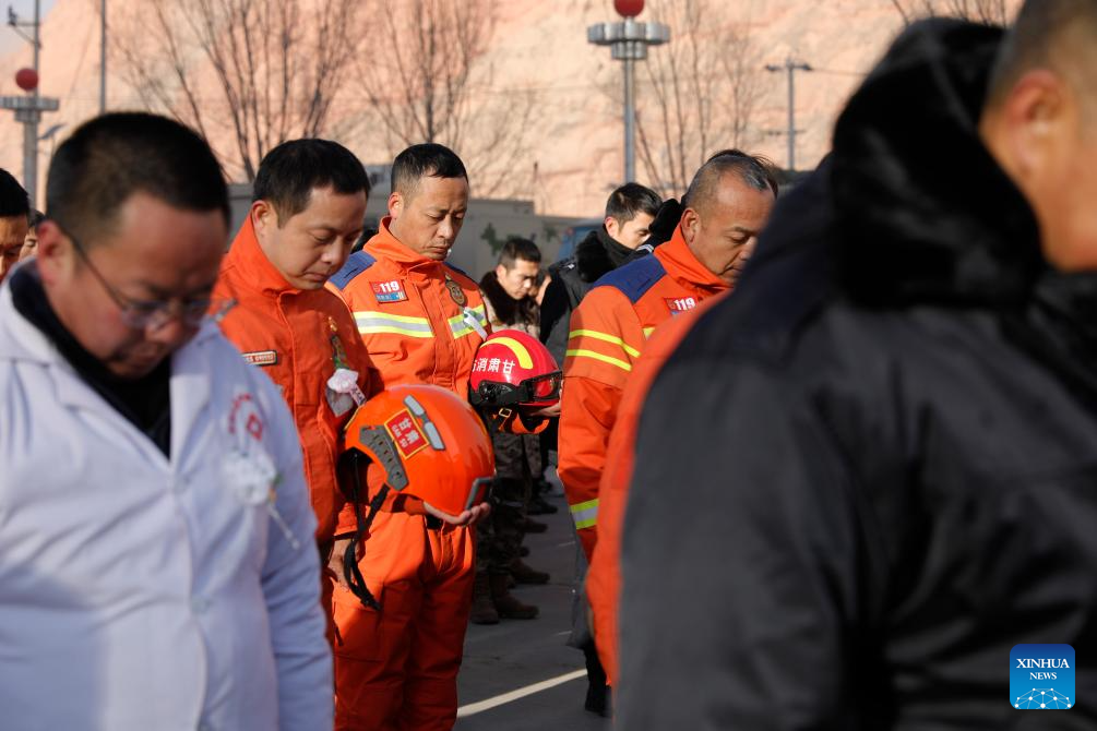 People pay a silent tribute during a commemorative event for earthquake victims at a square in Dahejia Township of Jishishan County, northwest China's Gansu Province, Dec. 25, 2023. A 6.2-magnitude earthquake jolted Jishishan County of Gansu Province on Dec. 18. (Xinhua/Fang Xin)